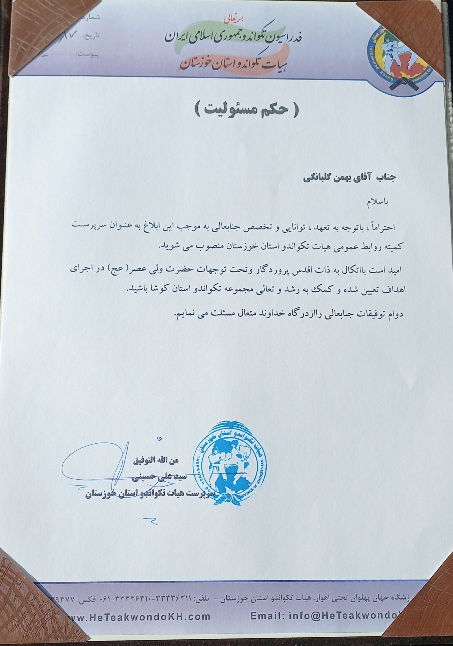 طی حکمی از سوی سید علی حسینی سرپرست هیات تکواندو استان خوزستان؛