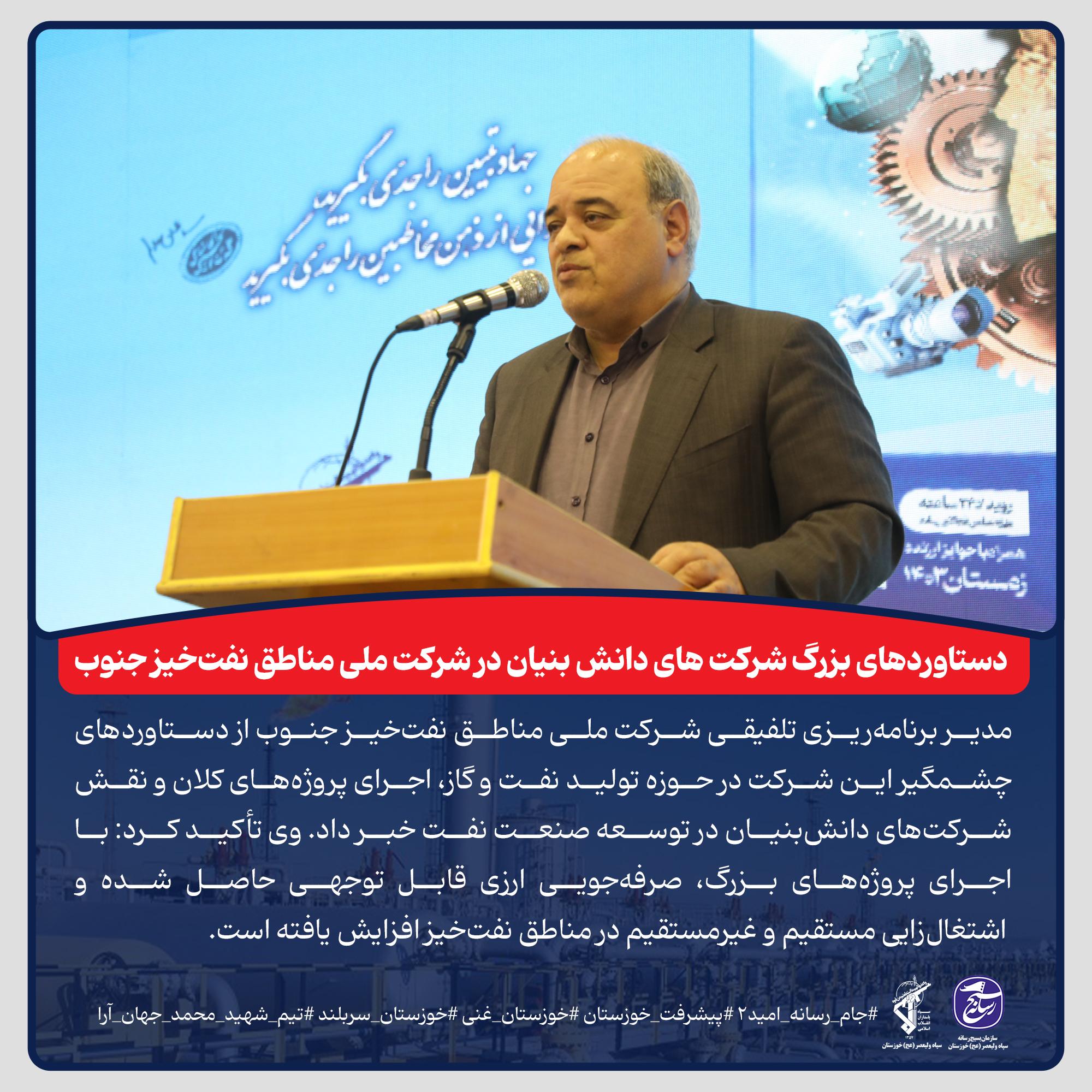 وی با اشاره به نقش شرکتهای دانشبنیان در توسعه صنعت نفت، گفت: شرکت ملی مناطق نفتخیز جنوب تاکنون ۲۵ قرارداد تولید بار اول با شرکتهای دانشبنیان منعقد کرده است. این قراردادها منجر به صرفهجویی ارزی ۲۷۲ میلیون یورویی و اشتغالزایی مستقیم و غیرمستقیم برای هزار نفر شده است.